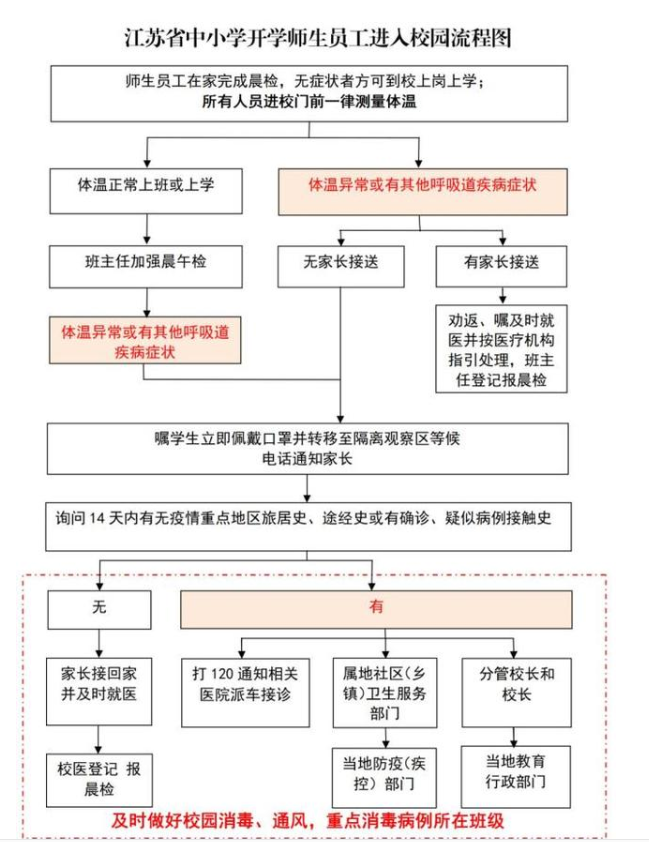 江蘇省規定開學時間,并作出教職工和學生進入校園流程圖,新聞指出現在疫情減緩,但是任何的工作單位都不能掉以輕心,學校更是如此,學生全天在教室里,空氣經常不流通,住宿生健康更是需要老師關注的,不要害怕出現問題,出現問題及時隔離班級學生并上報給相關部門。