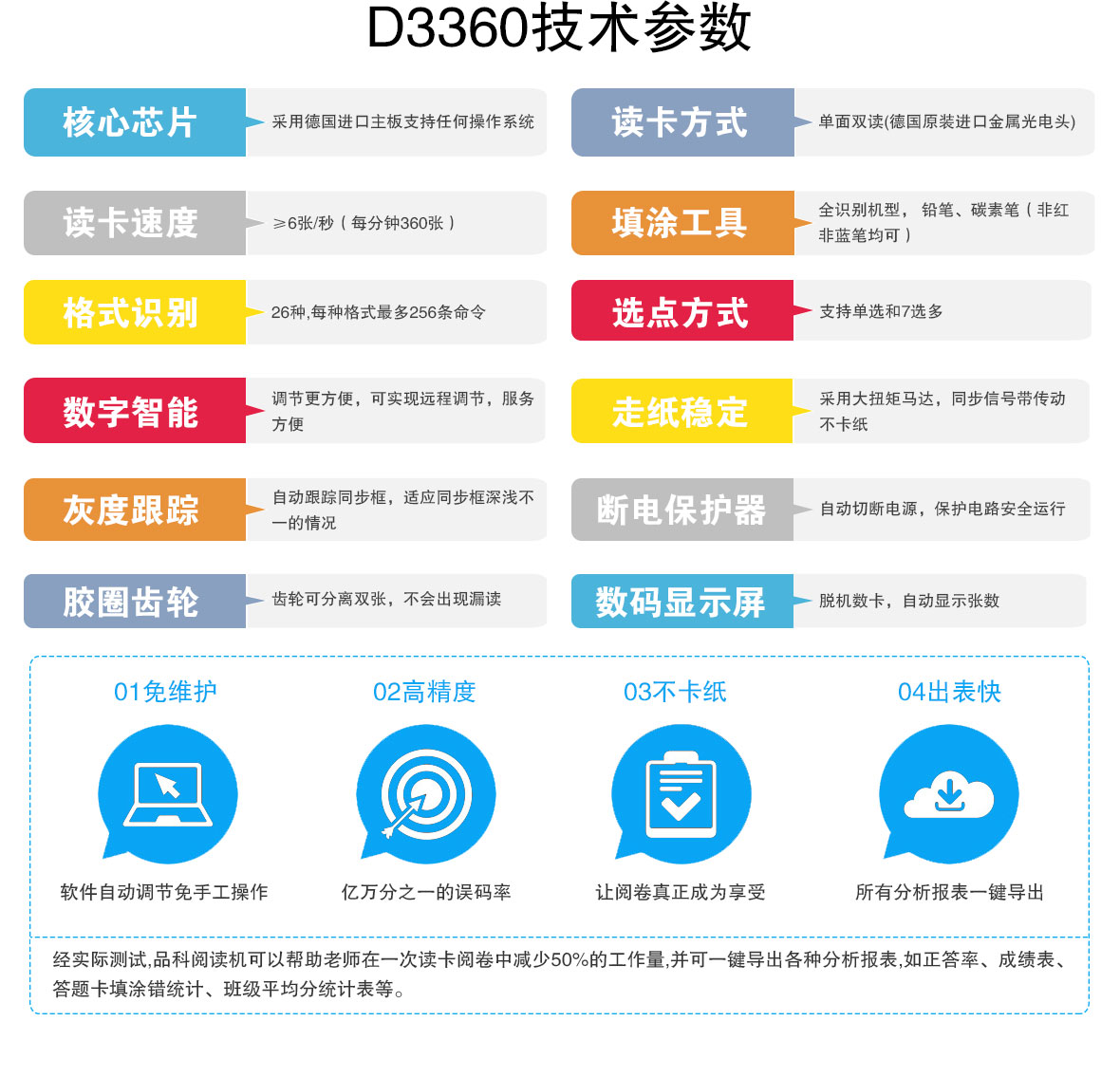 光標閱讀機全稱為光學(xué)標記閱讀機,閱讀機D3360三年包換,全自動數(shù)卡精確分析,采用德國進口芯片,掃描速度達到6張/秒