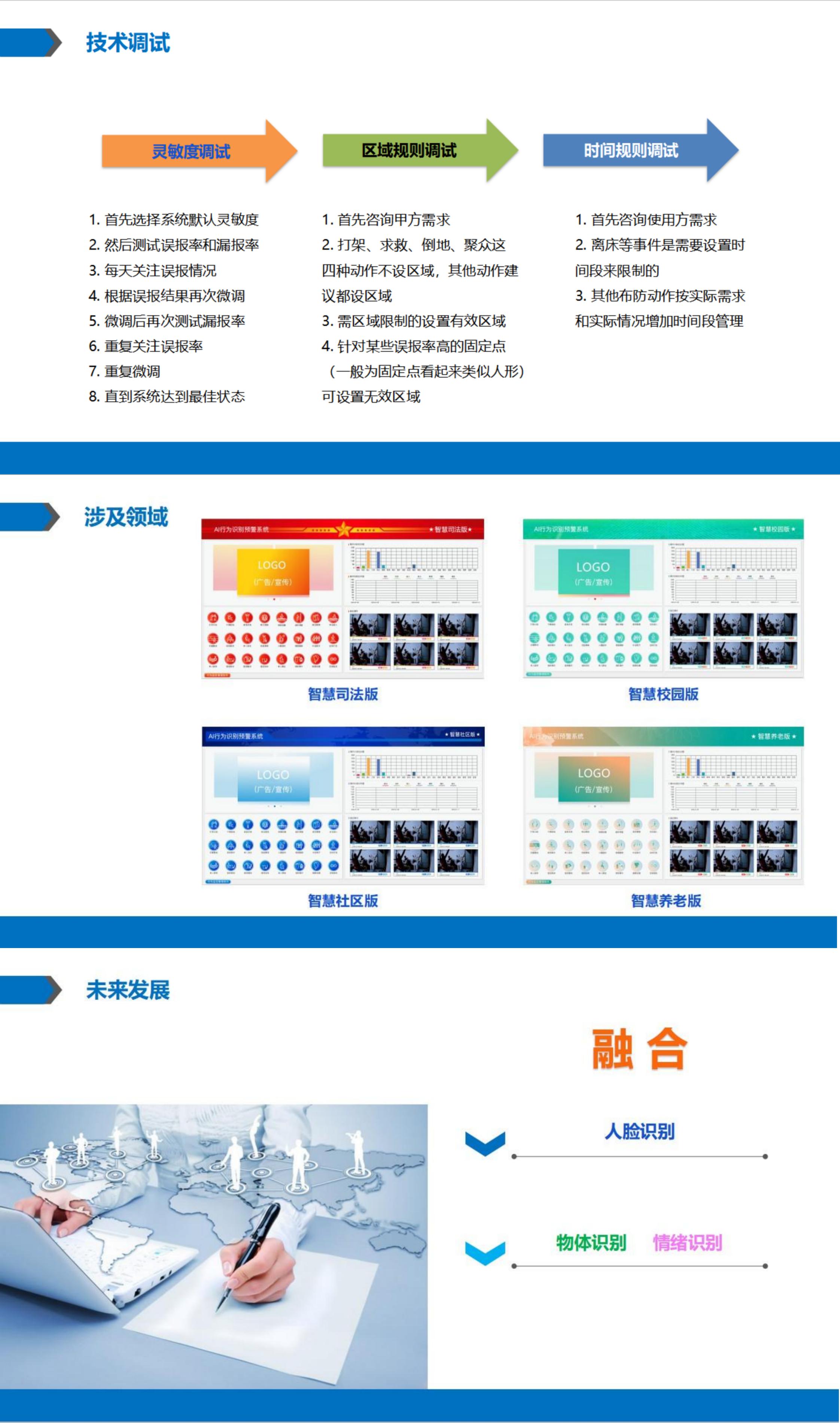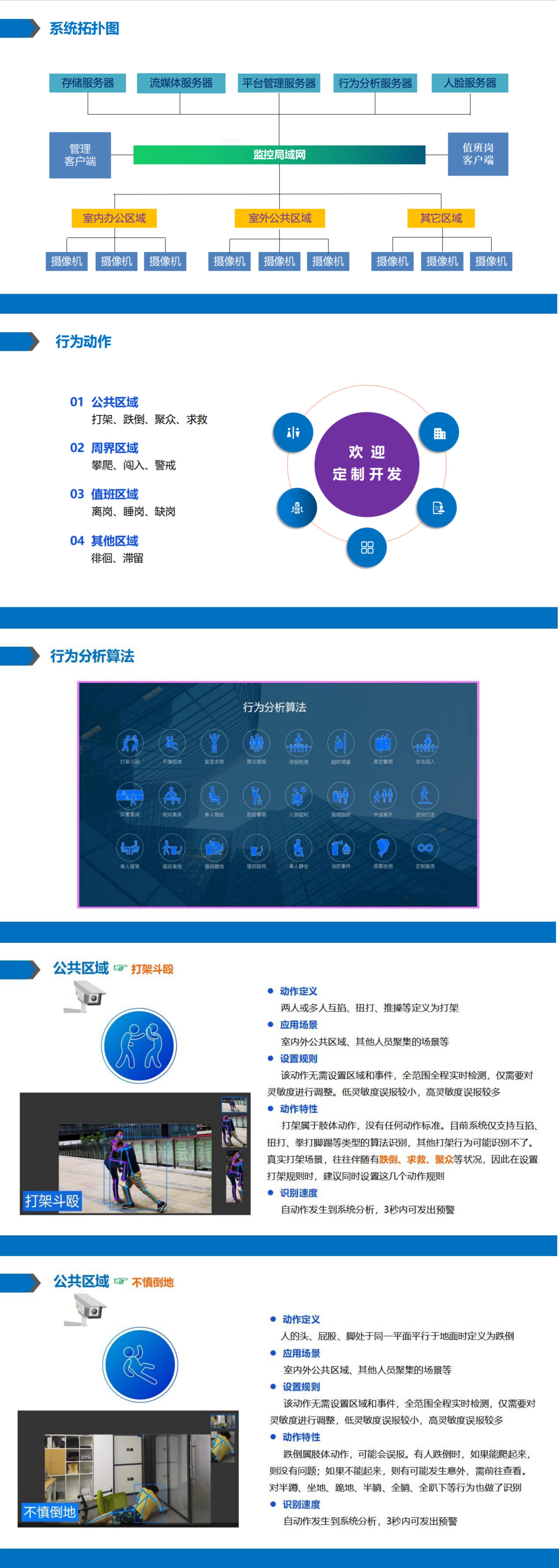 AI行為分析預警系統:人工智能技術解析視頻中的異常行為(傳統監控+AI=智慧監控),是一款能通過監控攝像機拍攝回來的視頻畫面去自動識別分析場景下發生的異常行為并預警的智慧監控預警系統。提升風險預警,事前干預,應急事件處理聯動。